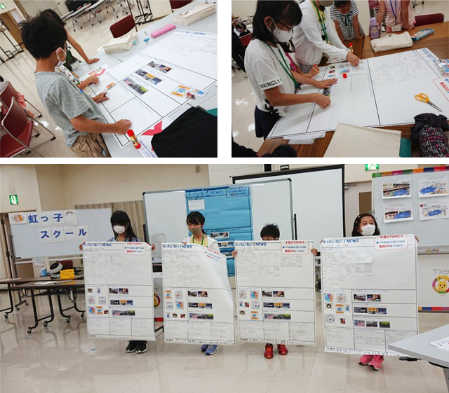 グループに分かれて、1枚の壁新聞を作成しました。「これからは、ちょっと嫌いなものも、全部食べきる!」「商品は手前からとる!」など、食品ロスを減らすために、自分にできることは何かを新聞づくりで学びました。あとは実践するのみ!